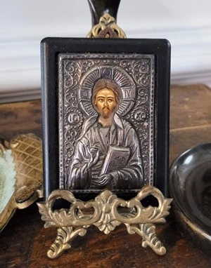 Everything here, except the chest, was bought at estate or yard sales. (Oh! Not the flowers. They, I believe, were part of my Temu experiment.) The chest actually came from an antique mall. I don’t very often buy at shops and malls. I’m definitely not my ideal customer, but I believe it’s because I’m a lifelong thrifter, furnishing my home on a tight budget over the years through yard sales and estate sales. But I do, every once in a while, find something at an antique mall or shop that has to come home with me. The chest was one of those things. $200, if I remember correctly.